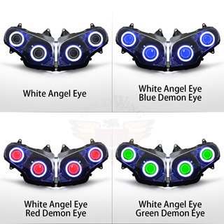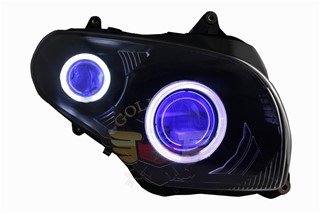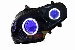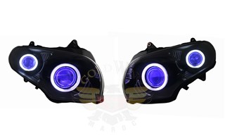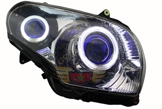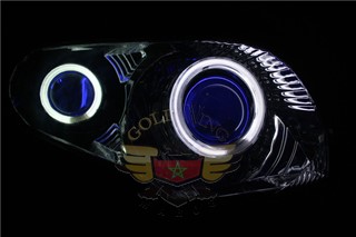 The angel eye is the CCFL (cold cathode fluorescent lighting) light attached around the projector lens, it will be light up by using angel eye inverter (igniter). Normally, several different colors are available for the angel eyes, such as White, Blue, Red, Green and Yellow. You can choose one desired color among those.