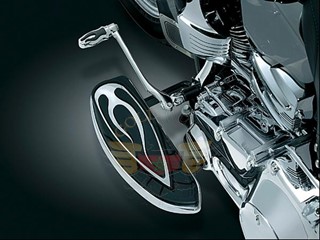 All day long, all they see are the bottoms of your boots. But when you're standing around with the crowd looking at bikes, that's when your Flame Board Covers strut their stuff. Standing out without being pushy, the chromed flame inlays play nice with the rest of the Kuryakyn bling that makes your bike unique. Direct replacements for the stock floorboard covers, the assemblies sit on top of the stock steel base plates so no comfort is compromised & the raised rubber edge keeps your boots off the pipes.7522 ,Flame Driver Board Covers Fits: All ’80-’09 Electra Glides (except ’04-’05 FLHTCSE & ’06-’09