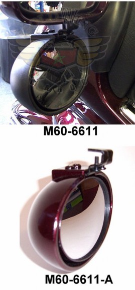 The adjustable rear view mirror has universal application. It easily attaches to any mirror. It will provide additional rear viewing along with the front mirror. Because it attached on the mirror lip, it allows for full utilization of the front mirror. The swivel action on this large mirror makes it easy to adjust for maximum effect. The mirror housing is black and measures 4” wide x 2 ½ “ high. It is also available, by special order only, in GL1800 & GL1500 colors listed on Add On 2008 catalog pages 6,17 and 50.