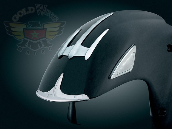 You decide where it looks best! Add it as a fender tip & have the cutting edge in fender tips, or move it back & add the perfect chrome accent. With simple peel-&-stick installation this little beauty will class up your front fender & cover unsightly stone chips. Fits:Honda:All VTX1300/1800 Yamaha: All V Star 1300/1100/650, all Road Star, all Roadliner/Stratoliner, & Raider Universal:4" or wider style fenders (does not fit fenders with flat center width) Gold Wing:'01-'09 GL1800 Models (As fender tip or front fender ornament)