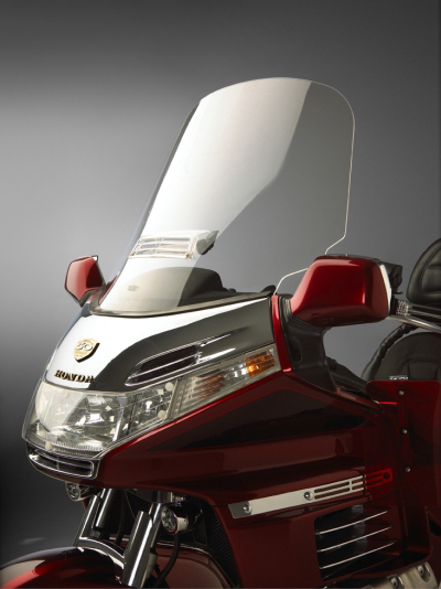 This custom Tour Windshield for the GL1500/6 retains the excellent design and aerodynamics of the GL1500/6, while offering considerably more rider and passenger protection with an additional 3-1⁄2" in height, 2" in width than stock OEM windshields. Made of Lucite® acrylic for the best in optical clarity. Made in USA.