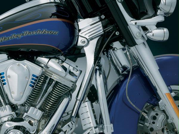 Designed from a clean sheet, our neck cover is a smooth, quickly installed addition to any H-D Touring Model. The right side cover has been enlarged enough to accommodate the in-line cruise control pull-off switch found on the idle cable of all ’02-’05 Models. The basic kit is offered in chrome or black & contains two-pieces to shroud the neck & extend down the frame adding brilliance to an otherwise dull area. The Deluxe Kit adds two snap-on downtube covers to add coverage almost all the way to the footboard mounts. Easy to install & great looking, this is a truly first class part! Fits:’95-’05 Electra Glides, Road Glides, Tour Glides & Road Kings