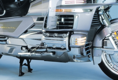 Replace the drab gray or color matched piece between the upper engine side cover and the rear step cover with shining chrome. Easily installs with only a Phillips head screwdriver, instantly brightening this dull area on the GL1500/6. Come as a pair. Fits Honda GL1500/6 Gold Wing .