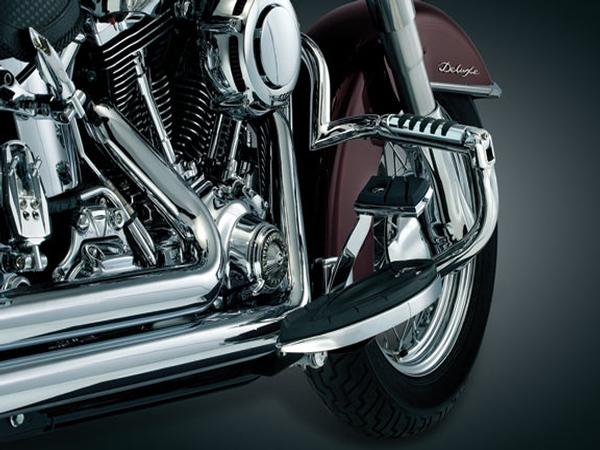 Combining a stylish engine guard with built-in highway pegs, the Ergo Plus Engine Guard brings innovative design to the limits. Use the highway pegs folded in or flip them out for an optional foot position! Designed with an ergonomic pull back, your feet will feel secure with less outward leg pressure no matter what position you have them in. With a slick mounting system, the Ergo Plus Engine Guard bolts directly to existing mounts on your frame and does not use any clumsy universal clamps. You'll be back on the road with your new engine guard and the comfort of multiple foot positions in no time.7529 Fits: ’00-’09 FLST Models.
