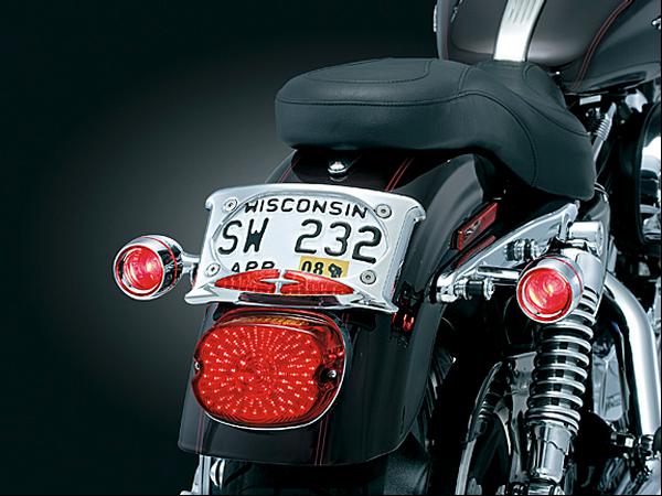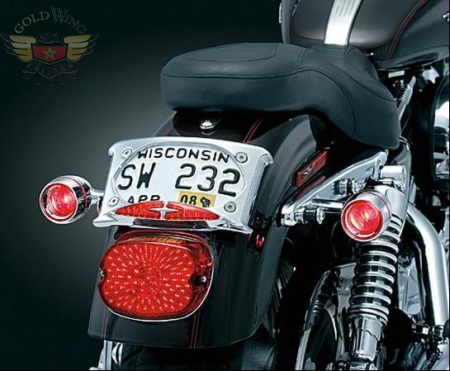 3166 ,Lighted Curved Laydown License Plate with Accent Taillights (ea). This "frame-up" leaves no chance for mistaken idenity! With its gentle curved contour & snug, fender hugging mount, this new license plate frame has a distinctive look all its own. For even more sizzle, red L.E.D. accent lights operate in run/brake, or run/turn modes. White L.E.D's provide additional plate illumination at night. A perfect complement to Panacea Taillights & Run, Turn, or Brake Controllers, this plate ties right in for all 3 functions. Designed to fit 4"x7" plates.