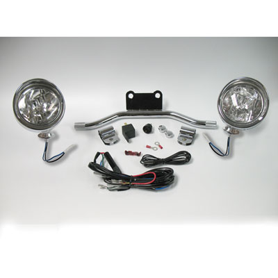 HALOGEN SPOTLIGHT KIT Kits come complete with a mounting bar bracket which will mount on the fork under the headlight.The lamps are a pair of highly polished 3-1/2" spot lights with high intensity, H3 55W bulbs.The spots are easily adjustable for dimming and come with a wire harness including relay to protect bike’s circuitry. 1-231, HALOGEN SPOTLIGHT KIT 55 Watt 3 1/2" Halogen Lights For Honda VT600.