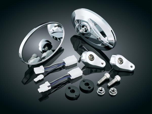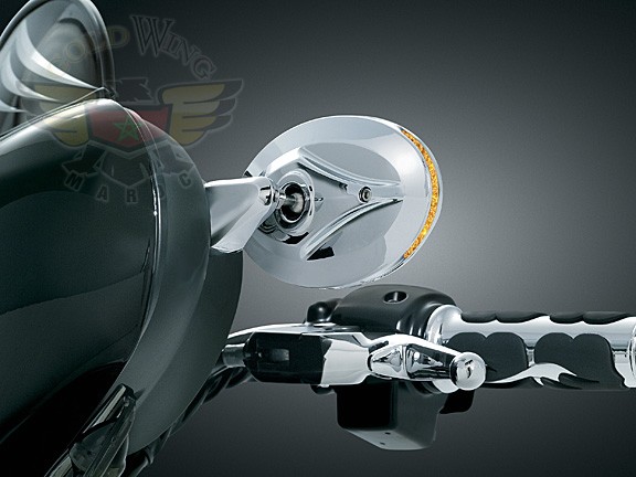 Utilizing our Blind Spot Turn Signal Mirror head with a cleverly designed mount, Küryakyn offers you an awesome combination of looks & function. The mirror heads & mounts are beautifully chromed & provide excellent rearward visibility. Amber L.E.D.’s in the outer edge of the mirror function as auxiliary turn signals & plug into the stock wiring harness. These flat glass mirrors are direct replacements for those found on the ’06-’09 FLHX or they can be installed on any ’96-‘09 FLHT, FLHTC, or FLHTCU. They utilize existing holes in the inner fairing on FLHX Models, but require drilling for installation on FLHT Models. They include a convenient template & all necessary hardware.