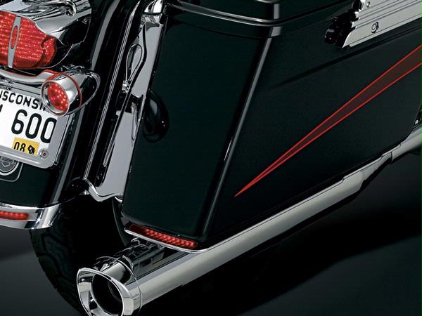 If you want to get someone’s attention, whisper. The subtle, directional shape suggests forward motion while providing a fine chrome accent line that clings to the bottom edge of the saddlebag. The small rear-facing red lights operate as auxiliary run & brake lights & punctuate the trailing edge of this classy accent. Wired easily via plug connections on ‘97-’09 Models. Fits: ’93-’09 Electra Glides, Road Glides, Street Glides, Tour Glides & Road Kings with hard saddlebags