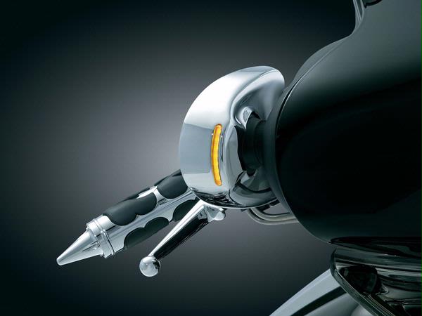 Lighted Mirror Capsfor FLHX Why keep your mirrors camouflaged within your fairing Add our fresh Mirror Caps and highlight those great lines by adding a sparkle of chrome in an unexpected location. Built-in amber auxiliary turn signals add extra visibility with a simple plug-in connection. Fits: '06-'08 FLHX and any '96-'08 FLHT, FLHTC or FLHTCU equipped with H-D P/N 91945-98B