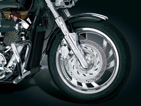 Nothing gets noticed like a nice front end, so create a shining first impression! Küryakyn Lower Fork Skins are sleek, stylized covers that apply a glistening layer of chrome to your plain stock fork sliders. Very easy installation.