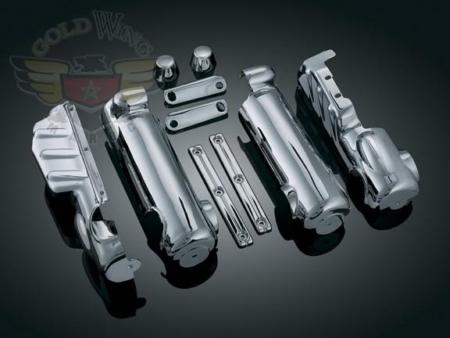 One of the most notable features of the big H-D touring rig is the big burley front end. What a shame that the lower legs and brake calipers from the factory come with polishing imperfections and such an uninspiring dull finish! Our innovative kit provides an easy, low cost way to put a flawless chrome finish on the lower legs (from the fender mounting bosses down) and the brake calipers with no need to dismantle! Constructed of beautifully chromed stamped steel for a long and beautiful life.