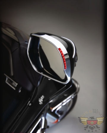 LED Visored Mirror Trims add a bright chrome visor and LED turn signal to the mirrors of the GL1800. LED turn signals are visible from the rear of the bike, adding safety through visibility while turning or changing lanes. Plugs into existing wire harness, no splicing required. Pair.