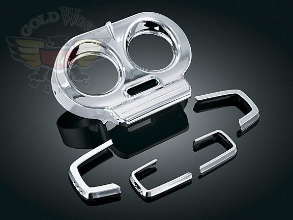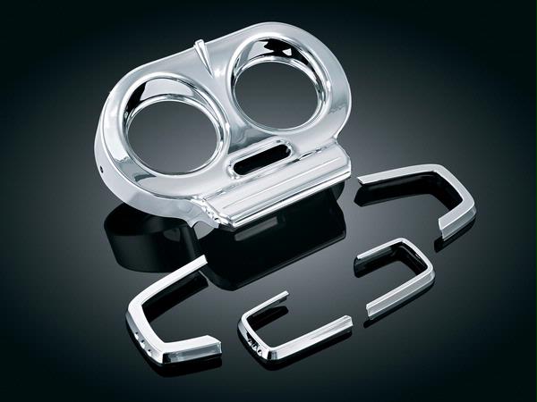 Forget about run-of-the-mill gauge bezels… this kit totally transforms the appearance of the Road Glide speedometer, tach, & fork nacelle. The main cover envelops the gauges &