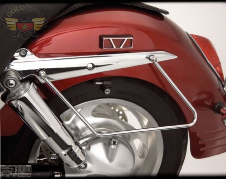 Les appuis d'acier au chrome montent à la parenthèse d'amortisseur arrière avec le nouveau matériel. Tient des saddlebags à partir de calibre de frein, de bras d'oscillation et de pneu arrière. Aucun perçage requis. Le matériel additionnel peut exiger des accessoires pour être installer. Pour Honda VT750 ACE 1998-2003