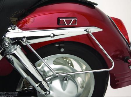 Acier chromé soutient le support pour dresser la parenthèse d'amortisseur avec le nouveau matériel. Tient des sacoches de selle loin de l'étrier de frein, des bras d'oscillation et le pneu arrière. Aucun entraînement exigé. Le matériel supplémentaire peut être exigé pour installer si un dossier de marché des accessoires a été installé.