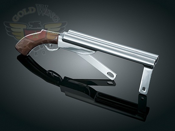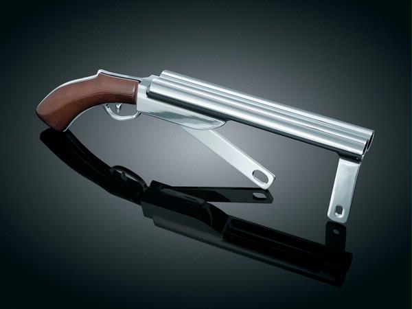 Next to brass knuckles, nothing says street tough like a sawed off shotgun. Jailbreak Larry dreamed up these hardcore belt guards & we’re bringing them to the street. Chrome-plated aluminum extrusions & castings with beechwood grips make these belt guards look like the real thing. Sturdy, welded brackets fasten to existing tabs on the swingarm. Go ahead, make my day!