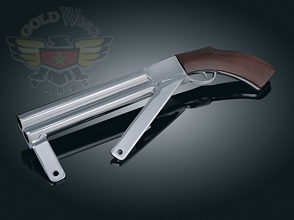 Next to brass knuckles, nothing says street tough like a sawed off shotgun. Jailbreak Larry dreamed up these hardcore belt guards & we’re bringing them to the street. Chrome-plated aluminum extrusions & castings with beechwood grips make these belt guards look like the real thing. Sturdy, welded brackets fasten to existing tabs on the swingarm. Go ahead, make my day!