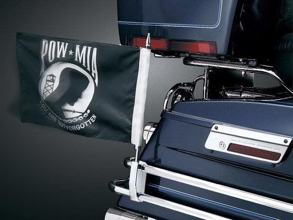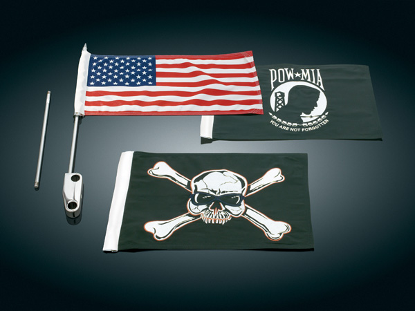 Fly your flag without worrying it will fly off your bike. Machined from aluminum, the sturdy mount is easy to install. A single bolt tightens the two clamp halves around the chrome Saddle Bag Guard that comes standard on the FLHTC and FLHTCU. The flag mount is also compatible with Road King, Road Glide and FLHT Standard if H-D's chrome Saddle Bag Guard kit is installed. All flags are 9"x 14". Includes 12"and 18" Staff, American, P.O.W. and Crossbones Flags.