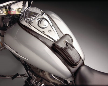 Make a bold statement with our textured black ostrich insert material with our Hopnel™ signature braided edges. Heavy simulated leather with a non-marring felt back to protect the motorcycle finish. Easily mounts with existing hardware. Each Tuxedo Tie includes a removable storage pouch decorated with a chrome concho and tie. Made in the USA.