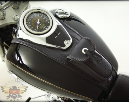 Make a bold statement with our textured black ostrich insert material with our Hopnel™ signature braided edges. Heavy simulated leather with a non-marring felt back to protect the motorcycle finish. Easily mounts with existing hardware. Each Tuxedo Tie includes a removable storage pouch decorated with a chrome concho and tie.