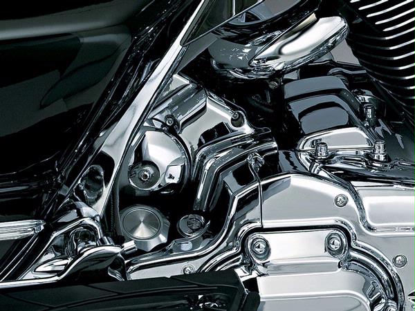 Here’s one of the nicest details for Touring Models we’ve developed yet. This one simple cover turns the hodge-podge of the starter solenoid & all of its related wiring into one sculpted, glistening unit. It’s designed to work with the stock starter end cover & complement our Transmission Shroud & Cylinder Base Cover. Now this once dull, unattractive part of your bike will sparkle in sunlight or accent lighting, & be easier to keep clean too! 7847