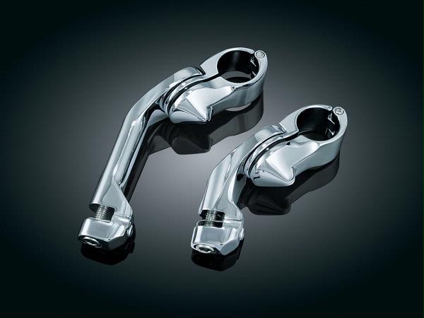 These Cruise Mounts with positive locking Quick Clamps offer an incredible range of adjustability. The entire assembly may be moved up or down on the engine guard. The arm and footpeg may be further adjusted along a vertical or horizontal arc. A unique clevis permits angle adjustment of the footpeg.