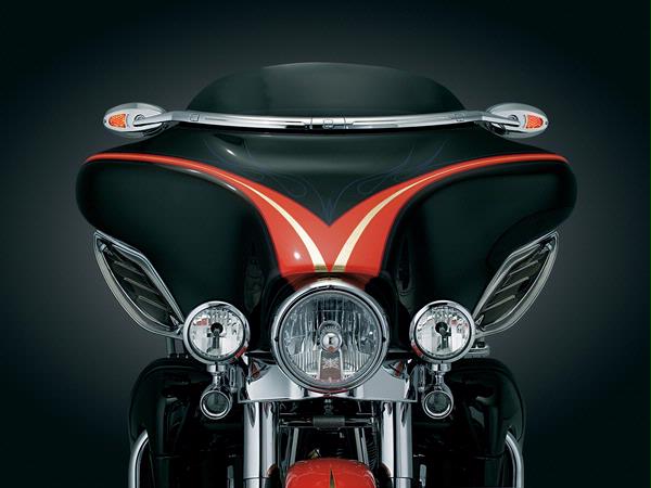 Wipe your bars clean with our innovative Windshield Mounted Mirrors. Sleek design blends a classy chrome windshield accent strip with gracefully curved arms to support the mirror heads. Ourconvex glass Turn Signal or Ellipse Mirror heads are positioned just above the upper edge of the fairing to provide great rearward visibility. Choose Turn Signal Mirror heads & you’ll add auxiliary forward facing running & turn signals.