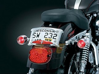 3166 ,Lighted Curved Laydown License Plate with Accent Taillights (ea). This "frame-up" leaves no chance for mistaken idenity! With its gentle curved contour & snug, fender hugging mount, this new license plate frame has a distinctive look all its own. For even more sizzle, red L.E.D. accent lights operate in run/brake, or run/turn modes. White L.E.D's provide additional plate illumination at night. A perfect complement to Panacea Taillights & Run, Turn, or Brake Controllers, this plate ties right in for all 3 functions. Designed to fit 4"x7" plates.
