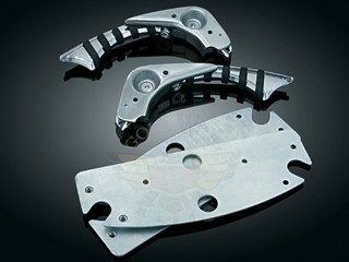 Adding the comfort of highway pegs to your FL Softail or Touring rig doesn't have to mean extra clutter. These stealthy highway pegs simply bolt in place on the bottom of the Traditional or Swept Wing H-D footboard. When deployed, they fold out & lock into place, much like a pocket knife blade. A release lever allows them to return to their original, almost invisible position when not in use. A hinge allows them to fold up & back if cornering touch-down occurs.