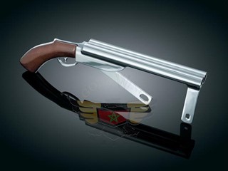 Next to brass knuckles, nothing says street tough like a sawed off shotgun. Jailbreak Larry dreamed up these hardcore belt guards & we’re bringing them to the street. Chrome-plated aluminum extrusions & castings with beechwood grips make these belt guards look like the real thing. Sturdy, welded brackets fasten to existing tabs on the swingarm. Go ahead, make my day!