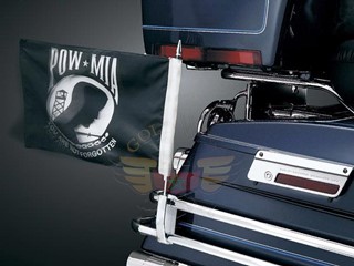Fly your flag without worrying it will fly off your bike. Machined from aluminum, the sturdy mount is easy to install. A single bolt tightens the two clamp halves around the chrome Saddle Bag Guard that comes standard on the FLHTC and FLHTCU. The flag mount is also compatible with Road King, Road Glide and FLHT Standard if H-D's chrome Saddle Bag Guard kit is installed. All flags are 9"x 14". Includes 12"and 18" Staff, American, P.O.W. and Crossbones Flags.