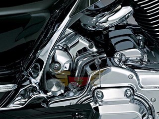 Here’s one of the nicest details for Touring Models we’ve developed yet. This one simple cover turns the hodge-podge of the starter solenoid & all of its related wiring into one sculpted, glistening unit. It’s designed to work with the stock starter end cover & complement our Transmission Shroud & Cylinder Base Cover. Now this once dull, unattractive part of your bike will sparkle in sunlight or accent lighting, & be easier to keep clean too! 7847