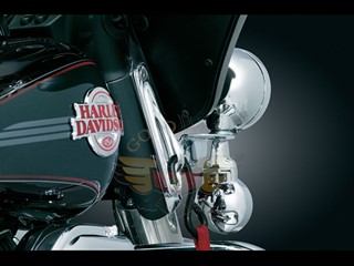 Tired of searching for good places to attach tie-down straps to your FLHT or Road King? The fairing and fairing lowers always seem to be in the way and using the handlebars is hard on the riser bushings. These stylish, custom brackets bolt to the sides of the front fork and provide a secure, easily accessible point to attach tie-down straps to the front of the motorcycle - Plus d'images (2)