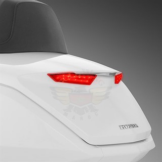 Big Bike PartsĀ® GT Tour LED Trunk Light for the 2018 GL1800 trunk combines a subtle chrome accent with a pair of multi-function LED lights. The lights match the style of the lower tail lights and lens design. This trunk light puts visibility and a brake light where it needs to be, up high, to enhance safety. Lights provide running, brake and turn signals. Comes with complete instructions.