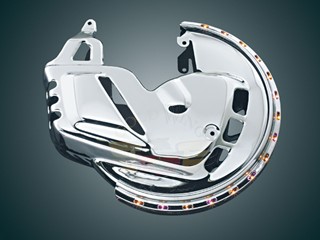 The Chrome "Ring of Fire" Rotor Covers will really take center stage on your GL1800. The beautifully chromed disc brake rotor covers change the plain, unfinished axle retainer, hub & brake rotor into one sleek gleaming unit. In the daylight, they'll shimmer in the sunshine, but night time brings out another dramatic effect. Brilliant, weather resistant amber L.E.D.'s punctuate the slots in the trim ring, while another inboard set of L.E.D.'s reflect on the front wheel setting it ablaze with your choice of color.