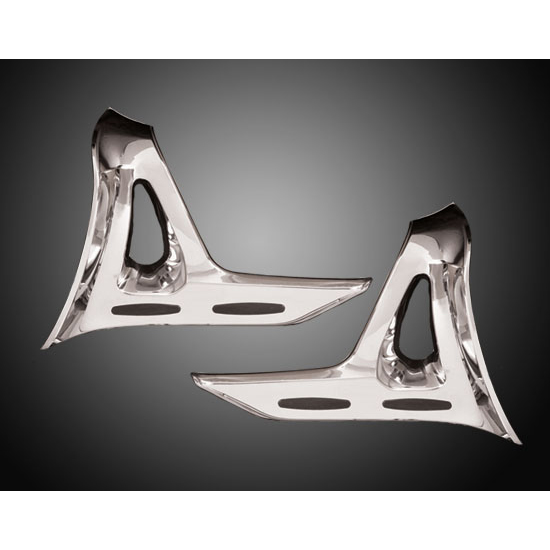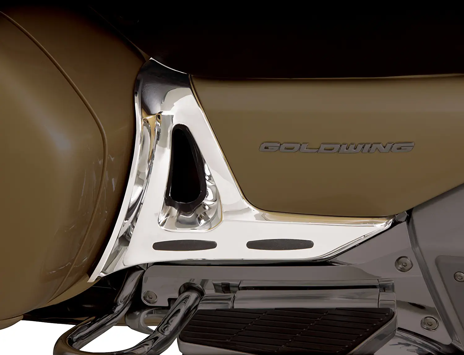 Cette paire de chrome ABS frottement des plaques de caoutchouc et remplacera le plastique noir mat OEM assiette sur la GL1800. Chrome brillant avec contraste élevé inserts en caoutchouc noir d'un grand oeil. Ils monter rapidement et facilement avec des vis. Ces batteries couvre coordonner côté merveilleusement bien avec le n ° 52-724 Voir Chrome & Rubber Frame Covers. Fits Honda GL1800 GoldWing.