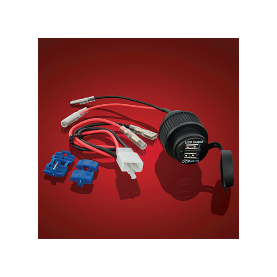 Big Bike Parts introduces their latest 2-port USB Auxiliary Socket, allowing charging of USB electronic devices. This Auxiliary Socket has two- 2.1 amp USB power plugs for use in charging MP3, GPS, iPhones and other devices. Wire harness to Plug ‘N Go on GL1800 2001- 12 or use the universal splice connections to wire into any 12 volt system.