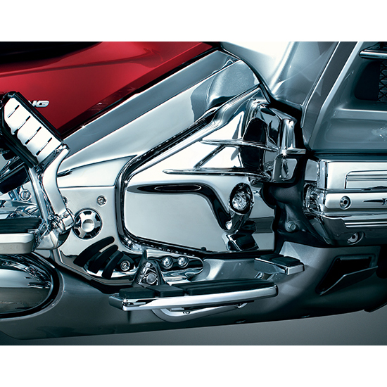 This is a pair of louvered transmission covers. These chrome plated ABS plastic covers are made by Kuryakyn and are designed to replace the factory transmission covers on the Goldwing GL1800's. They are a new louvered style that include a convenient dip stick access which allows you to check your oil without removing the cover. These install easily and will fit all Goldwing GL1800's from 2001-2012.